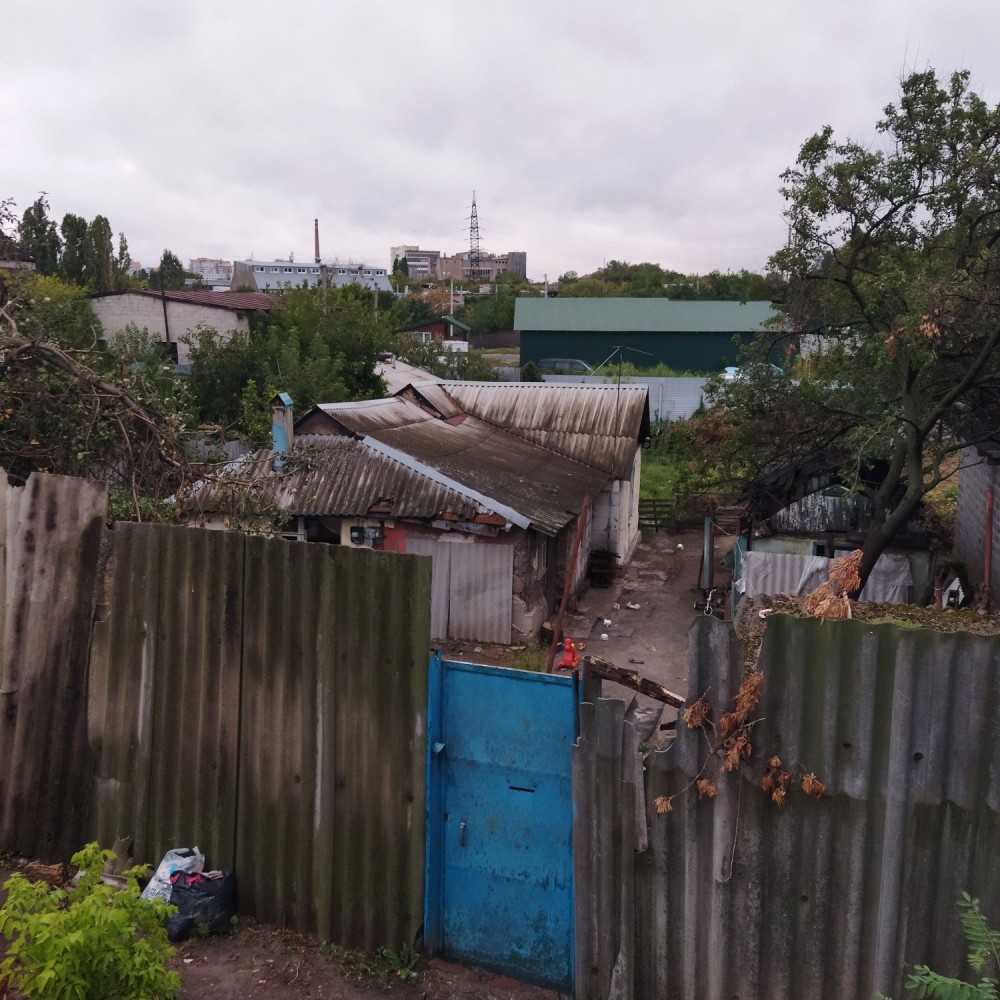 Дом после повреждений бурей летом 2025 года, на крышу коридора упали городские деревья вместе с электростолбом.