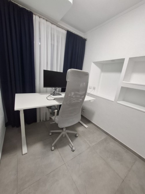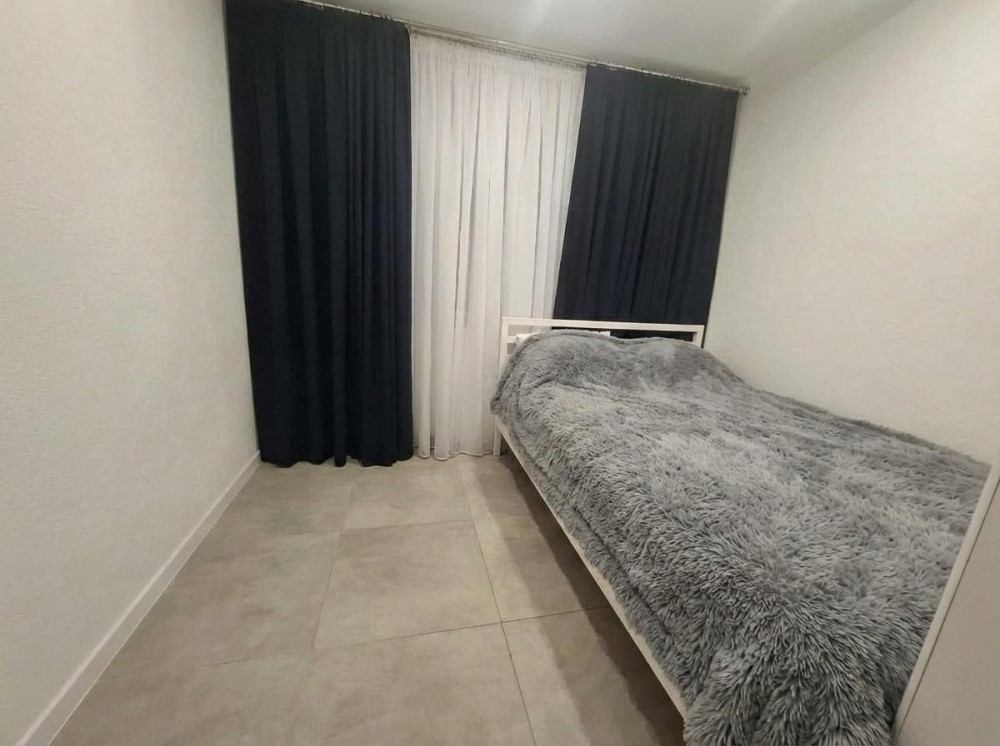 Двери из натурального дерева с отличной шумоизоляцией, единый пол из керамогранитной плитки без порожков, стены из декоративной штукатурки, шторы блэкаут во всех комнатах, кронштейны под телевизоры в зале и спальне.