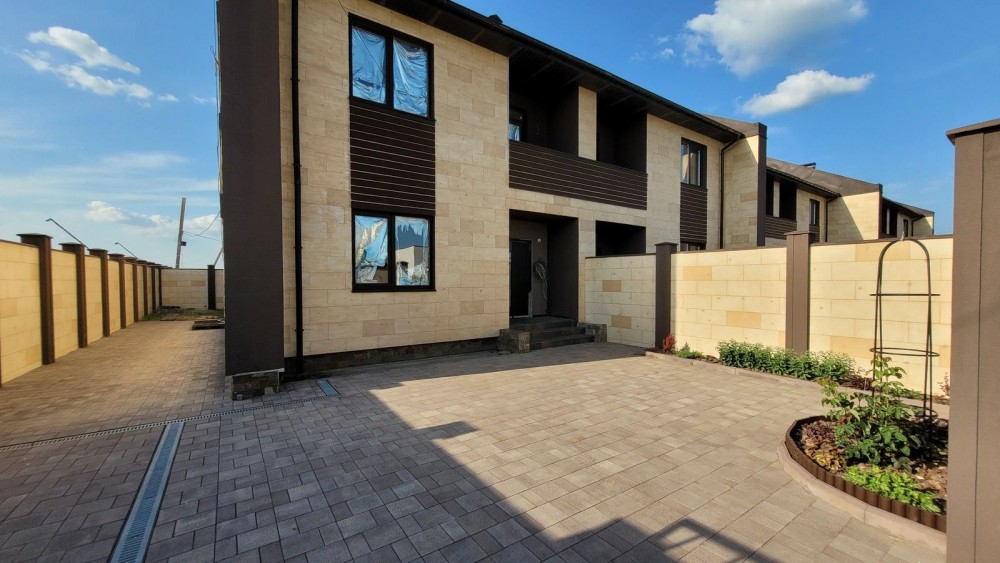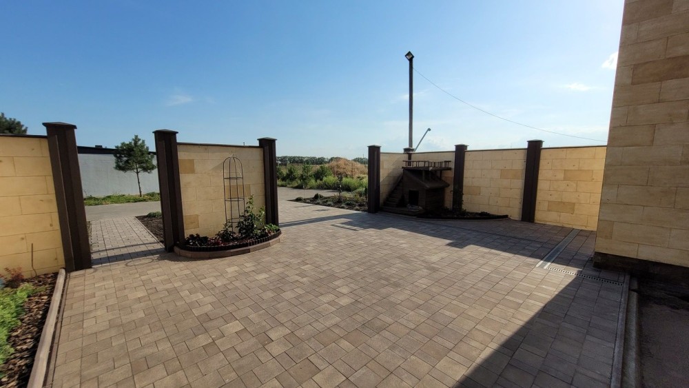 Парковка (покриття - тротуарна плитка) під 4 авто перед будинком. Задній двір 7м х 5,5м для барбекю, басейну, тапчанів або дитячого майданчика.