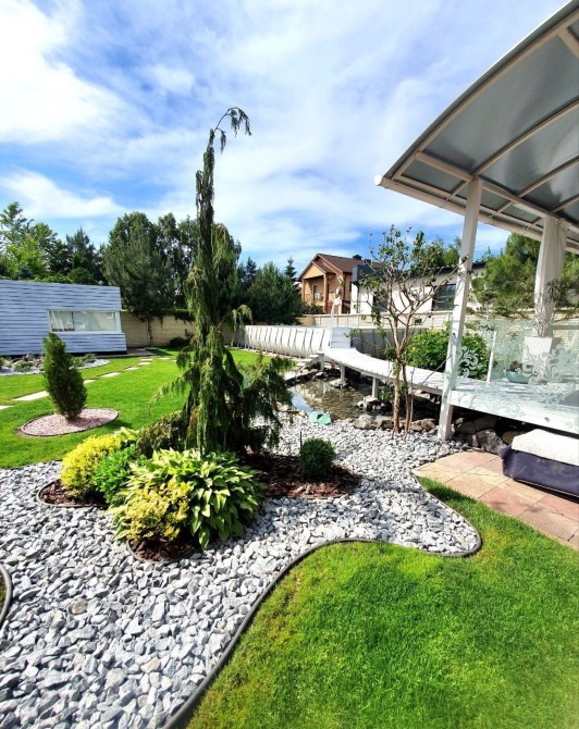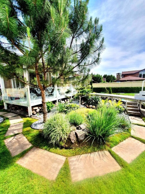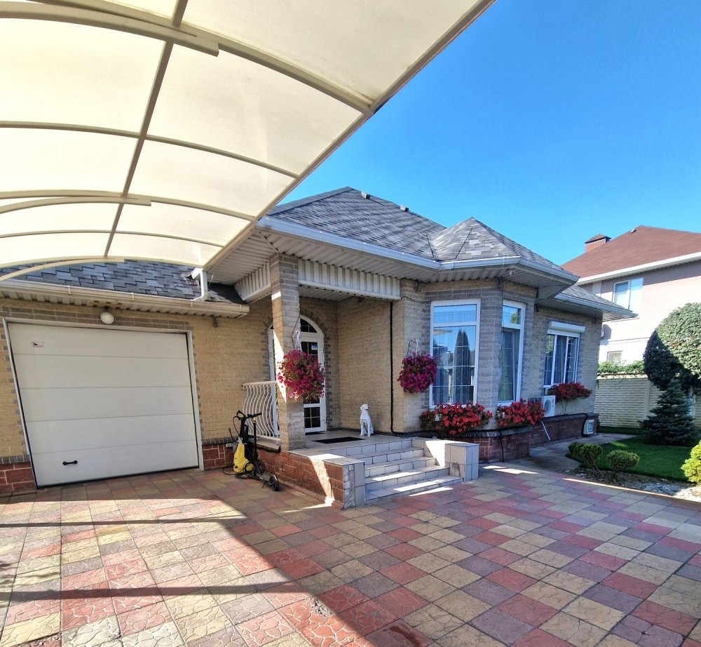 Во дворе крытая парковка с автоматическими воротами, сделан ландшафтный дизайн с автоматическим поливом.