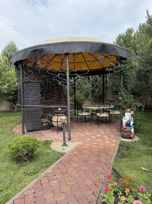 Зона барбекю+беседка,ландшафтный дизайн с автополивом,озеленение(Туи,голубые ели),фруктовый сад.