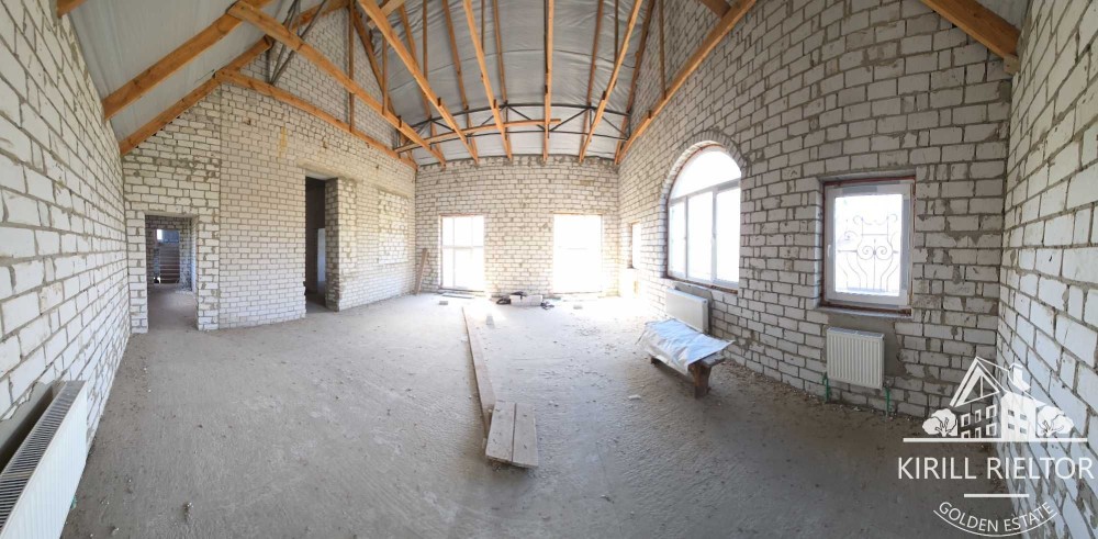 Внутренние стены дома частично оштукатурены, частично сделана стяжка на полу, разведено отопление, установлены газовый и твердотопливный котлы