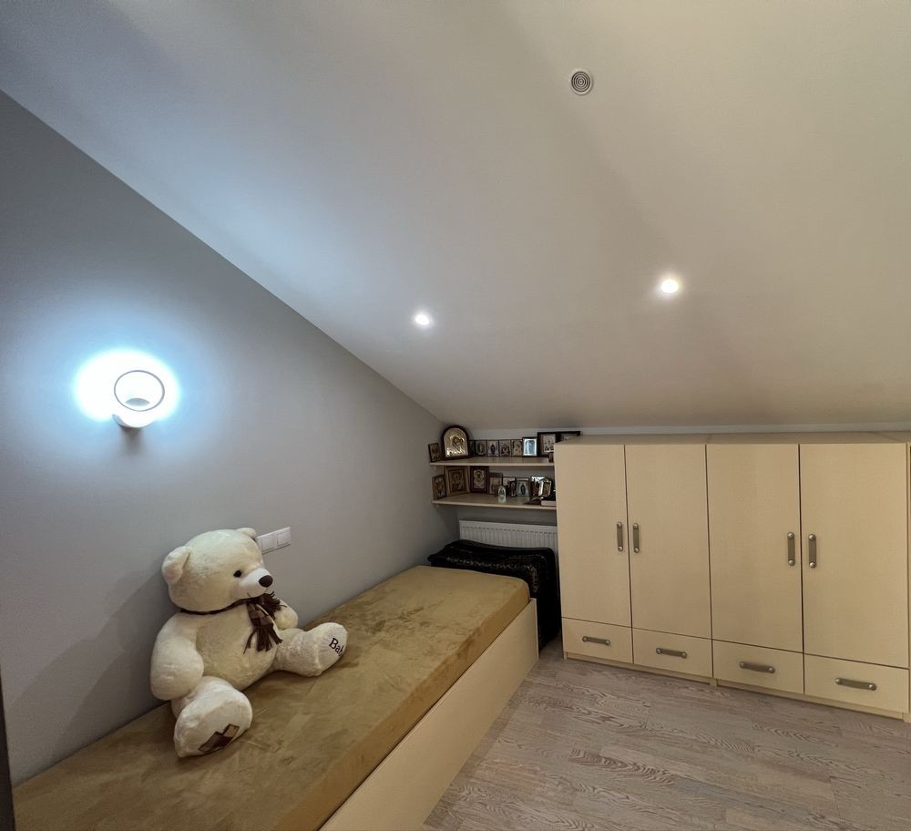 У будинку: перший поверх велика студія зонована на кухню, столову і зону відпочинку, санвузол (з душовою кабіною), коридор з великим вбудованим шкафом, окрема технічна кімната з водонагрівальним приладом, пральною і сушильною машинами. Другий поверх спальня батьків і дитяча, ванна кімната між ними.
