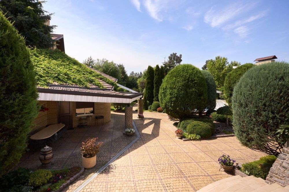 На участке в 26 соток настоящий сосновый бор, ароматные можжевельники, ухоженный газон с автоматическим поливом и уютные уголки для отдыха.