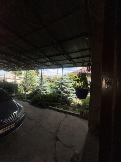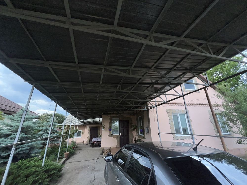 На территории также есть баня, летняя кухня с газовой плитой, большое количество хозяйственных построек. Установлен огромный навес, который покрывает двор и ведет прямо ко входам обеих частей дома — всегда сухо и удобно.