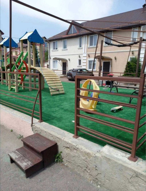 Имеется бассейн, детская площадка, просторная зона отдыха под навесом со столиками, печью барбекю.