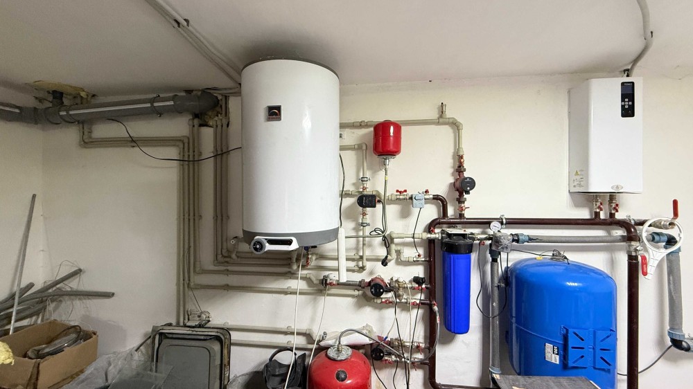 У котельні: котел, гідроакумулятор, розширювальний бак.