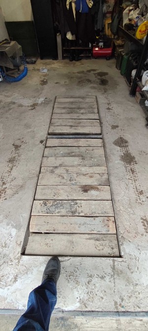Є оглядова яма з полицею та підвал на пів гаража зі стілажами .