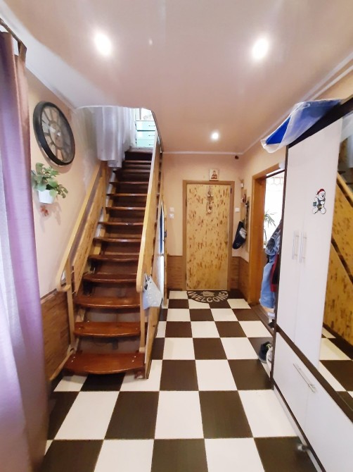 Дом построен из бетонных блоков, обложен селикатным кирпичём и утеплён пенопластом. Поэтому дом очень тёплый. Отапливается газом, но есть печка с грубой на первом этаже. В цокольном этаже подвал и хоз.помещение. На полу в кухне теплый пол, санузел под лестницей, туалет и душевая кабинка. Пол в комнатах ламинат. окна металлопластиковые по всему дому.