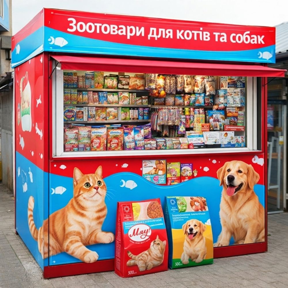Кіоск розташований у прохідному місці. Фасад оформлений під магазин товарів для тварин (котів та собак) — ідеально під зоотовари або суміжний бізнес.