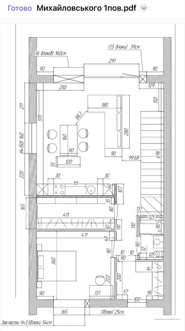 1-й поверх: кухня вітальня з виходом на криту терасу, гардеробна кімната, прихожа, сан вузол та кабінет;