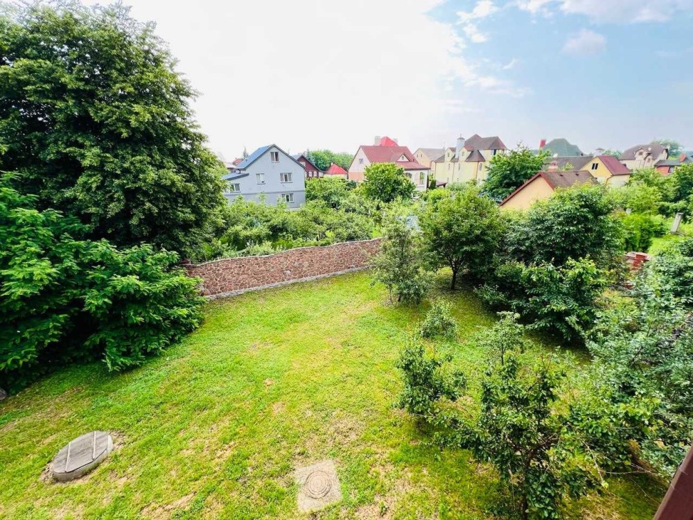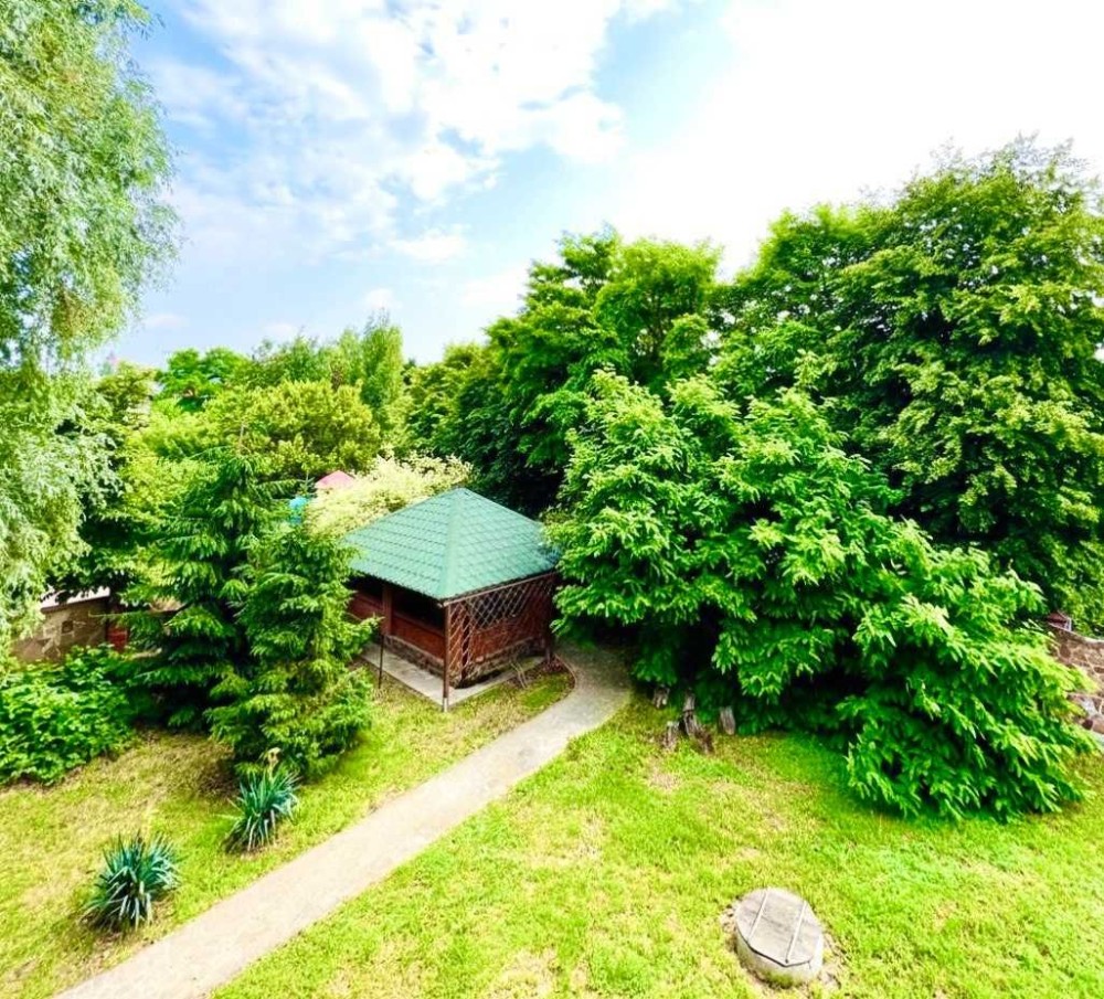Доглянута земельна ділянка: газон, садові доріжки, альтанка з зоною барбекю. По периметру добротний паркан. Автоматичні ворота (ковка). Парковка на декілька авто.