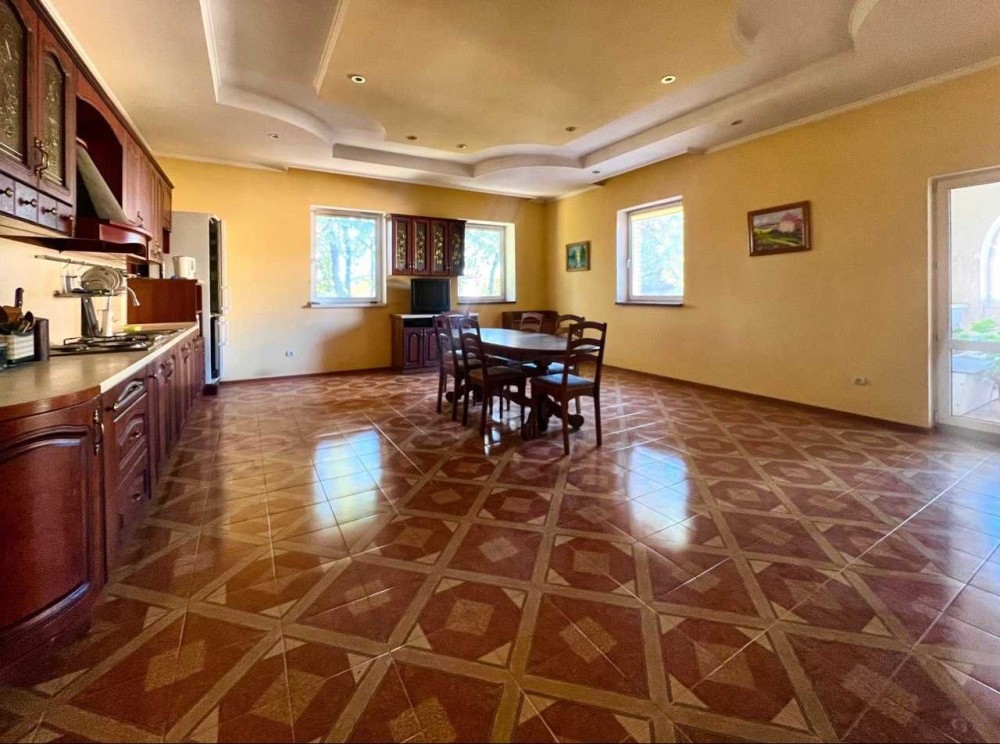 В будинку велика кількість житлових кімнат, каміна зала 45кв.м, простора кухня-столова 40кв.м, 4 санвузла, 2 утеплені, заскляні лоджиї, сауна, купель, кімната для відпочинку теж з каміном, котельня, гараж, господарські приміщення.