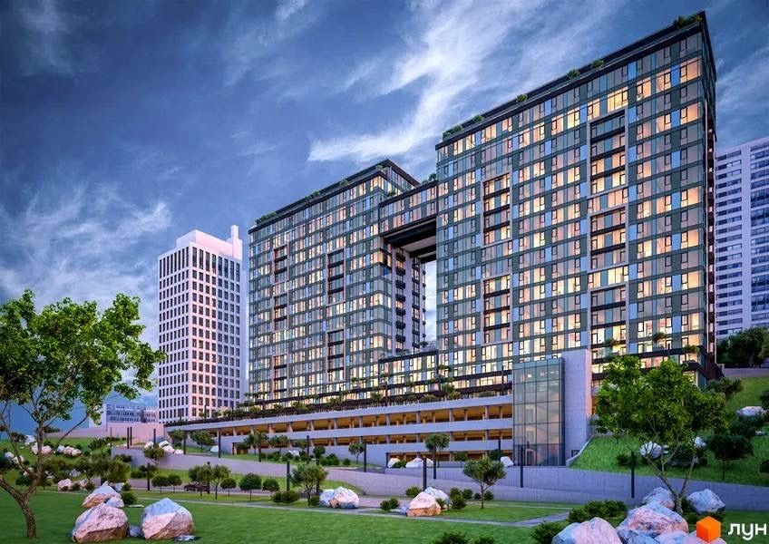 ЖК є частиною знаменитого силуета нашого міста, введен в експлуатацію і обживається. Комплекс бізнес класу з багаторівневим підземним паркінгом (за планом з автомийкою). Парковою территорією з ресторанами і салонами