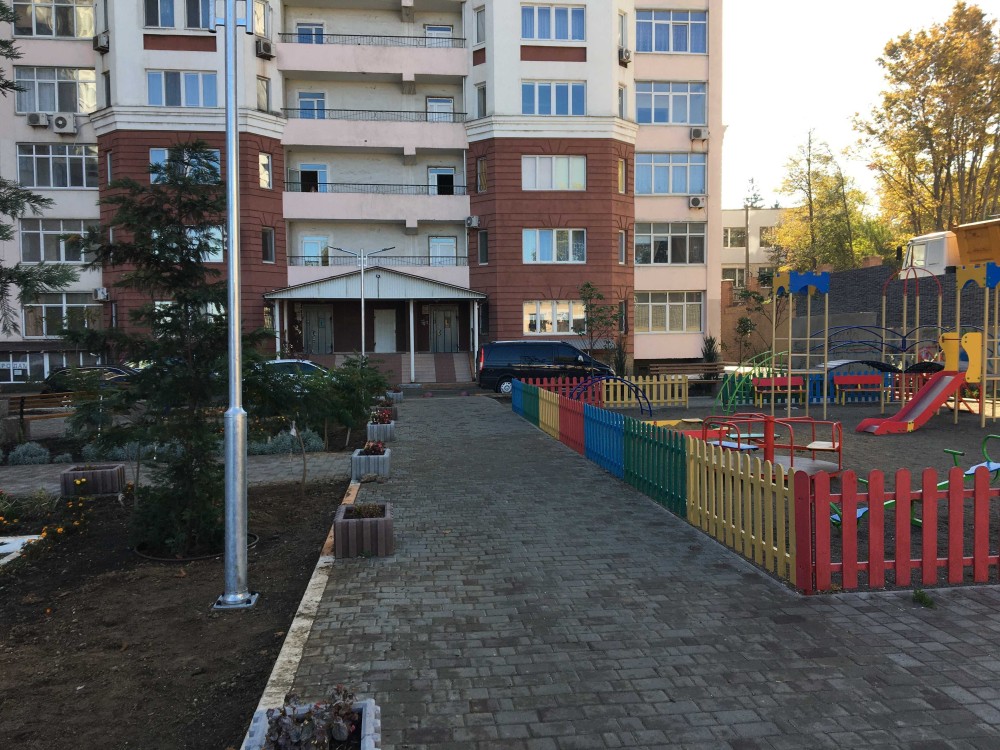 Закрытая территория двора.На въезде шлагбаум.Ухоженная придомовая территория.Во дворе парковочные места,детская площадка.