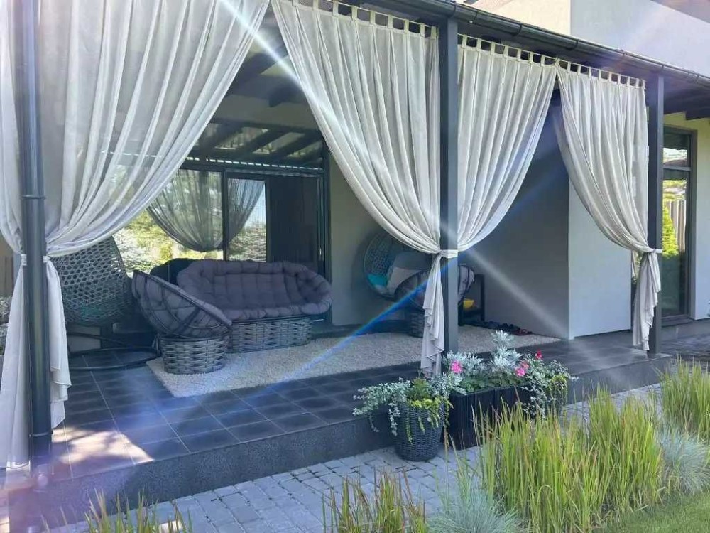 Представляет собой: дом 197м2 снаружи и внутри 140м2+20м2 терасса+37м2-гараж на 1 авто, 20 сот.приват участок огорожен капитальным забором, автоматические ворота, двор выложен плиткой, озеленение и освещение территории, видеонаблюдение выведено на телефон, сигнализация. При постройки дома были использованы дорогие, высококачественные материалы, известных европейских производителей, так как он строился для себя по авторскому проекту.