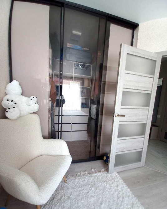 - Виділена гардеробна з прозорим склом , лаконічне зонування