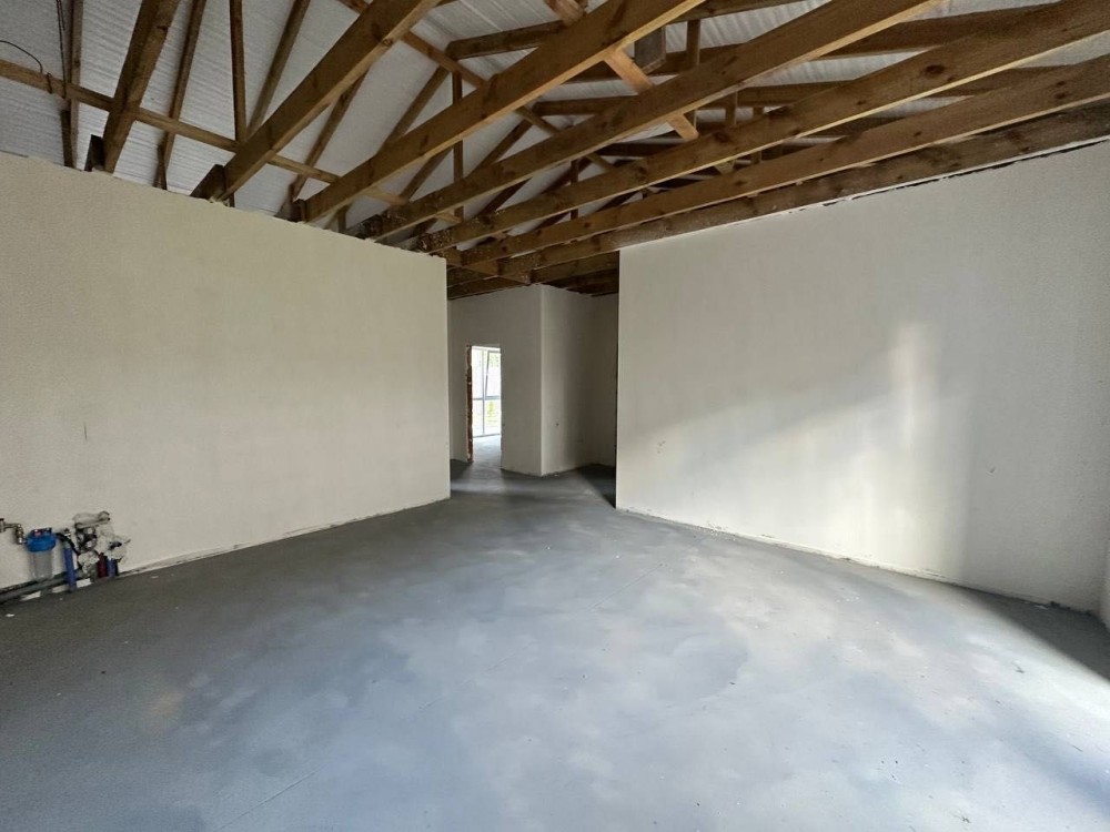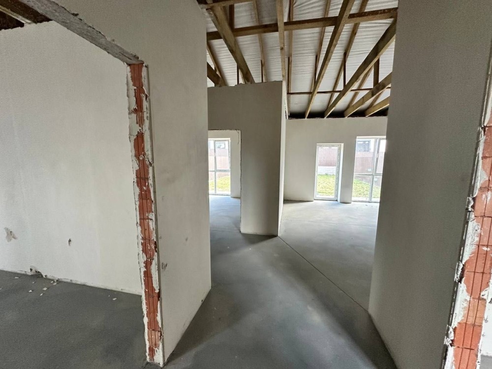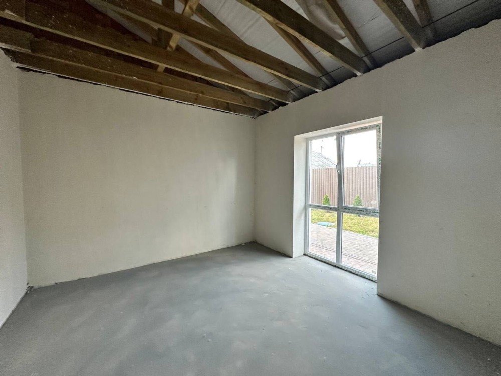 Планування продумане: простора кухня-вітальня та три окремі кімнати. Є передня і задня ділянка — можна облаштувати терасу, барбекю-зону чи місце для відпочинку.