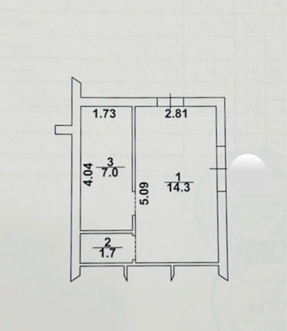 Зал - 14,3 м², санвузол -1.7 м2 та підсобне приміщення - 7 м².