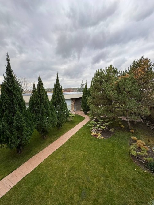 Ландшафт — як у каталозі преміальних садів: сосни, туї, берези, автоматичний полив і чиста, структурована естетика, яка кожного ранку вітає вас свіжим повітрям та дзеркальним блиском річки.