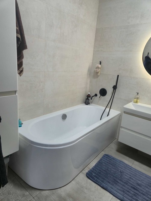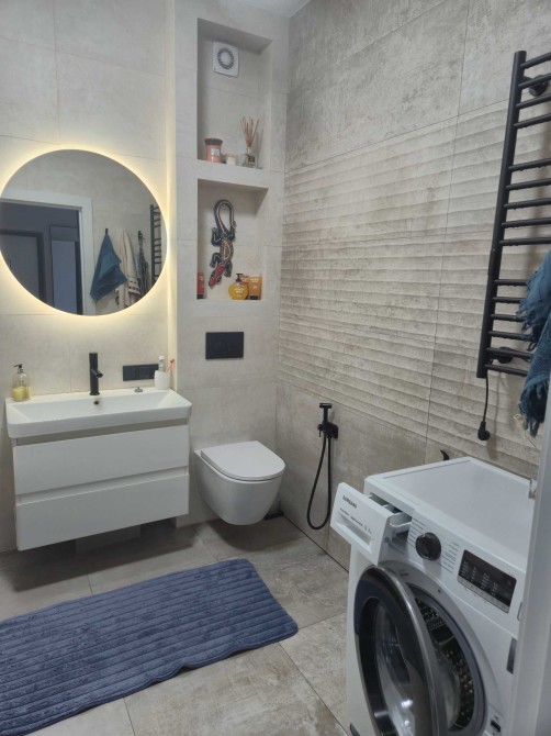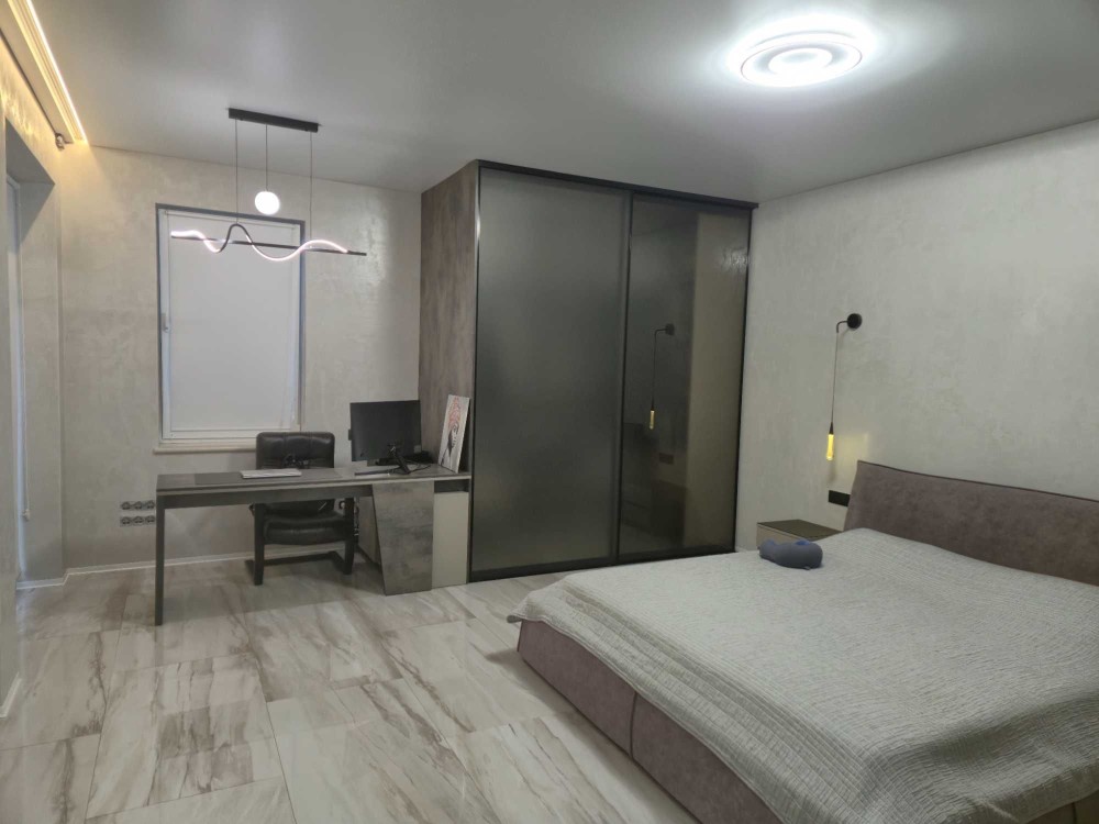 Додаткова інформація: великі металопластикові вікна, «тепла підлога» в усіх приміщеннях, натяжна стеля, ролети «Блек аут», на підлозі - іспанський керамограніт розміром 0,6*1,2 м, в санвузлі - іспанський керамограніт розміром 0,4*1,20 м, ванна з закругленим кутом, навісний унітаз, система біде.