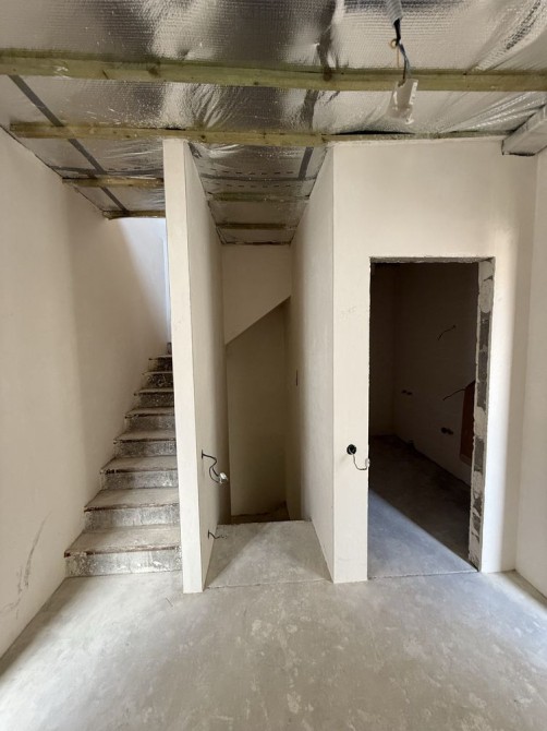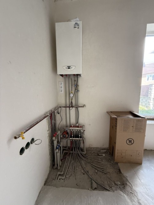 • 1 поверх: кухня-студія, велика кімната, санвузол. Тепла підлога по всьому першому поверху. Встановлено двоконтурний котел та фільтри очистки води. Електрика проведена, стіни вирівняні та поштукатурені — залишилось оздобити під свій дизайн.