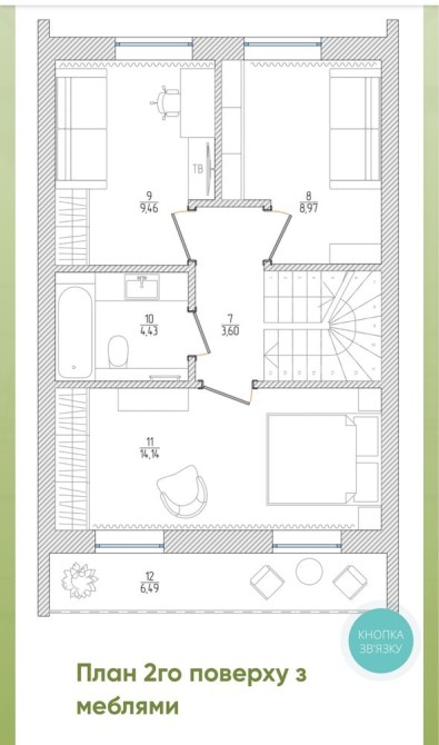 2 поверх: 2 спальні, ванна кімната, гардеробна або кабінет, балкон.