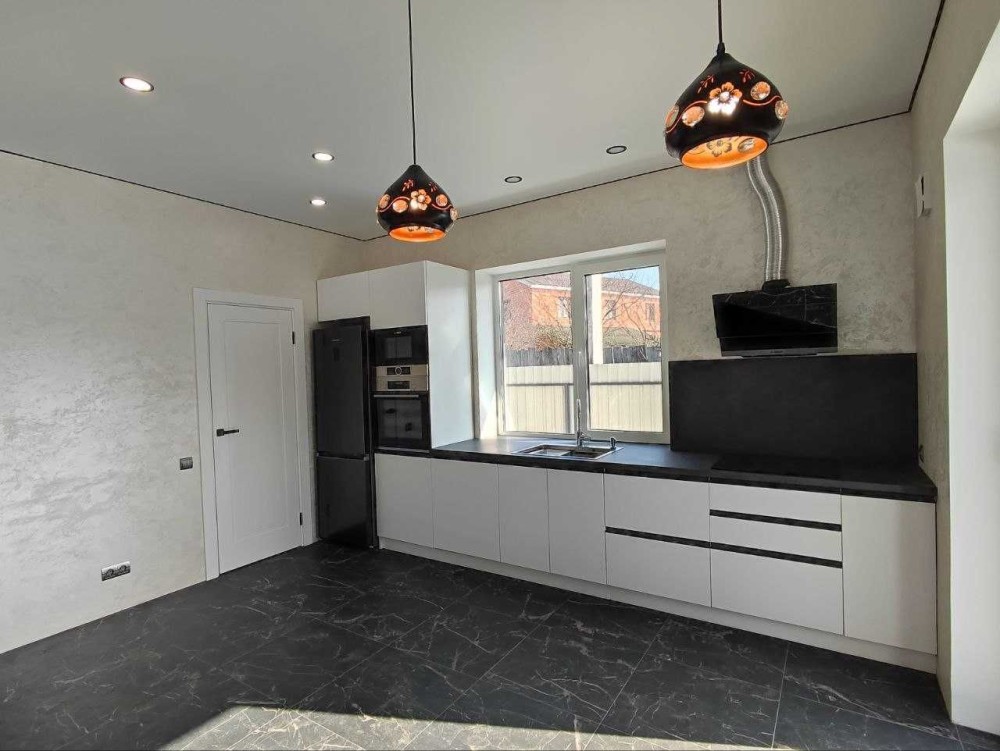 Вбудована кухня з технікою: мікрохвильова піч, духова шафа, посудомийна машина, витяжка, та варильна панель- фірми Bosсh, холодильник, бойлер, електричний котел, рекуператор, та диван на кухні.