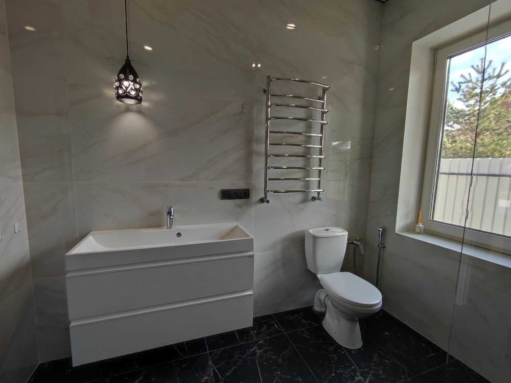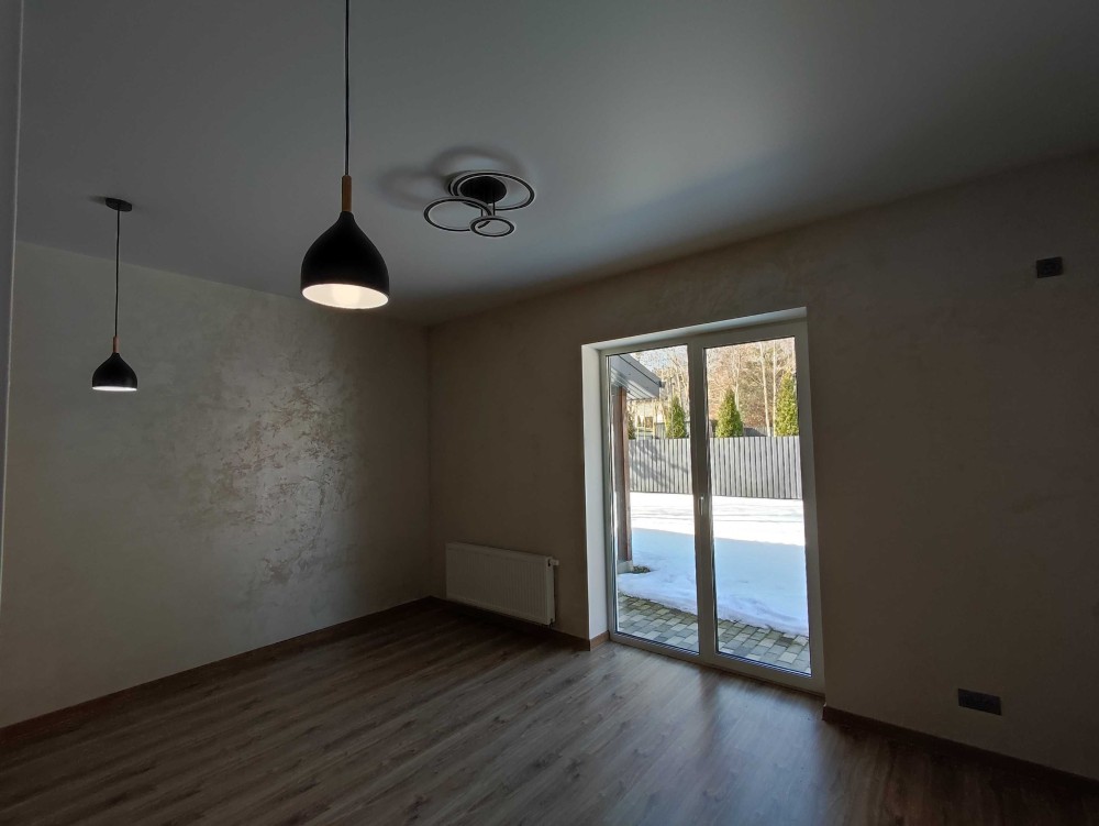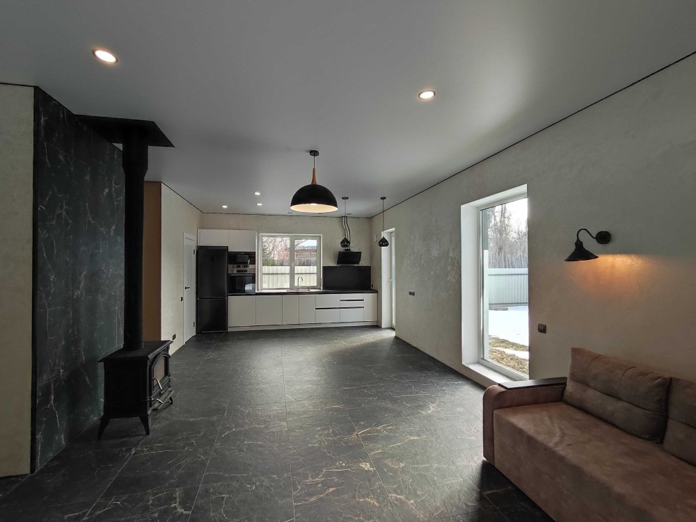 Планування: 3 житлові кімнати, велика кухня-вітальня, 2 санвузли (1-й гостьовий, 2-й душова кабіна та місце під ванну), технічне приміщення, кладова, коридор.