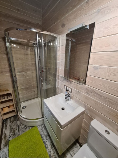 Первый этаж : прихожая, большая кухня гостиная с камином, спальня, сауна, сан узел, гардеробная.
