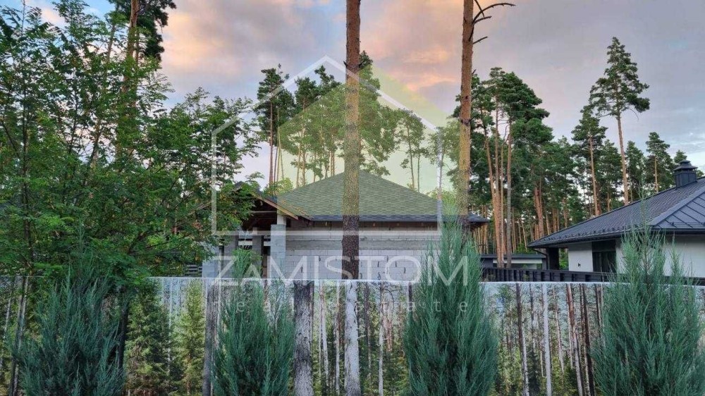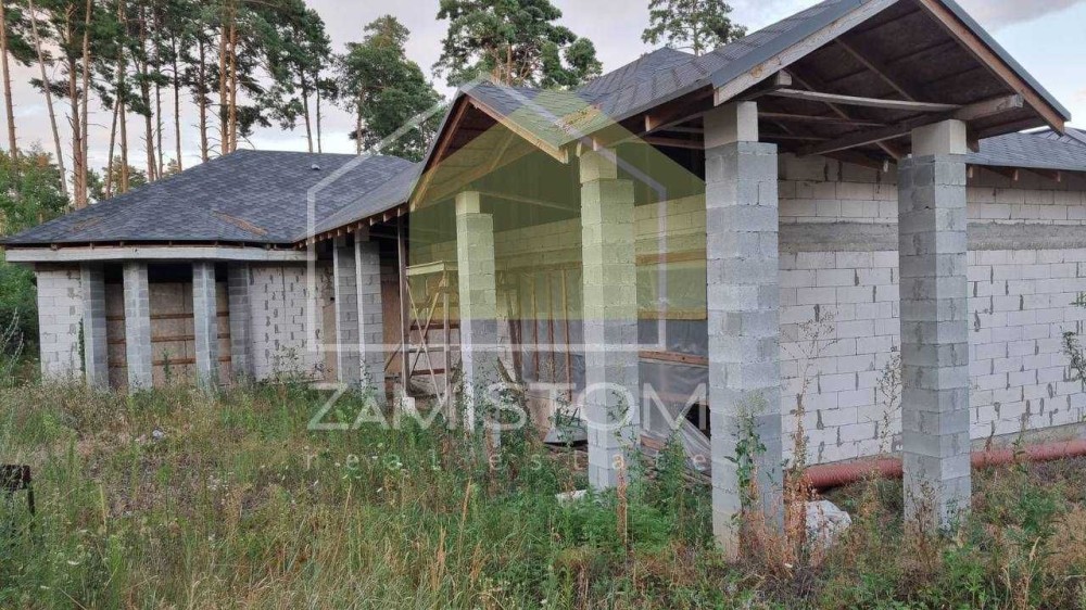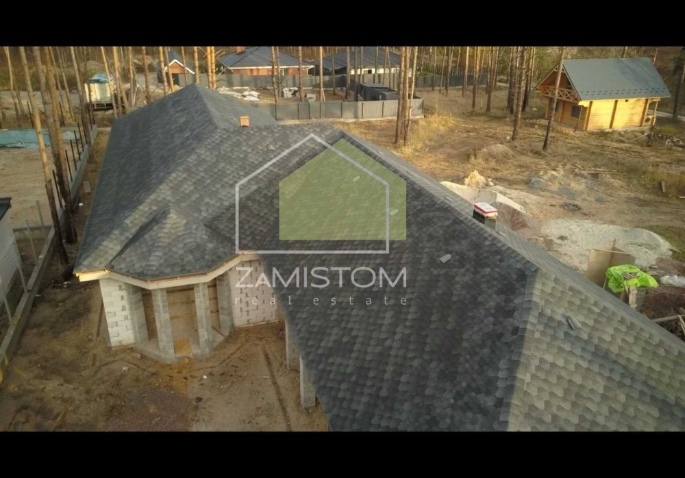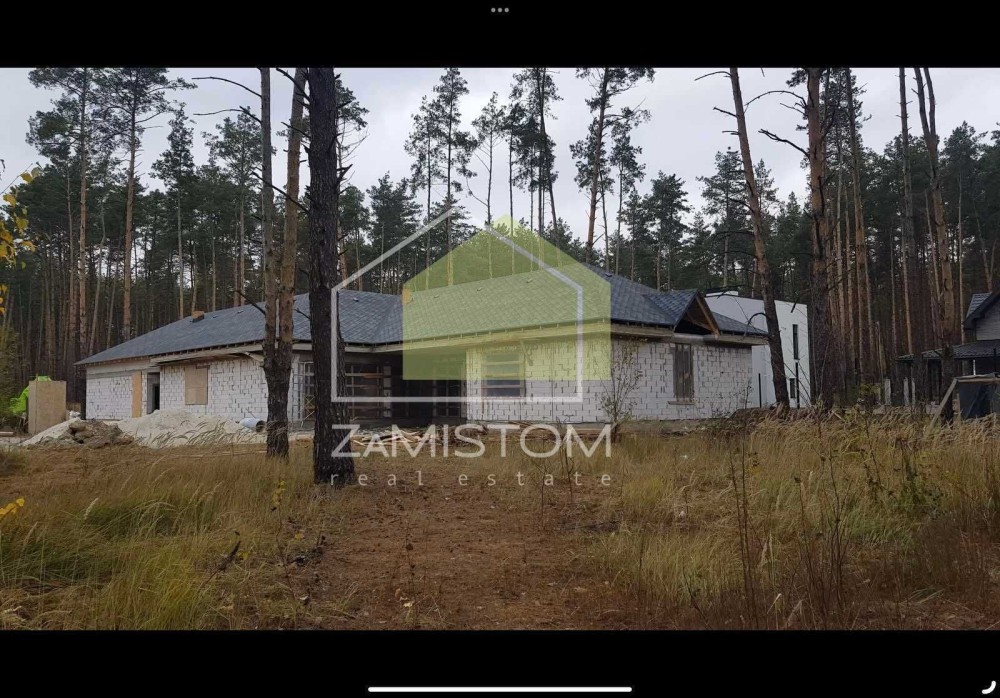 Продаж  будинку 280 м2 у сосновому лісі, КМ Підкова. Завершено будівництво стін та кровлі . У проекті дві будівлі :основний будинок та гараж-майстерня.