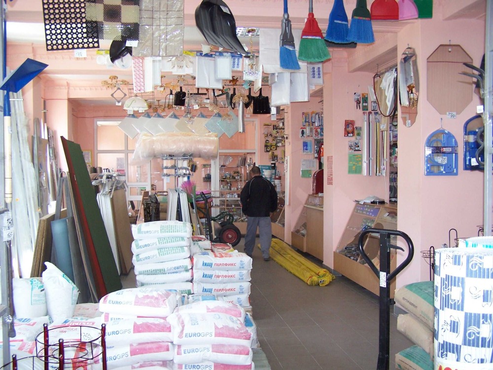 Площадь помещения 330 м2, работает магазин промтоваров и стройматериалов.