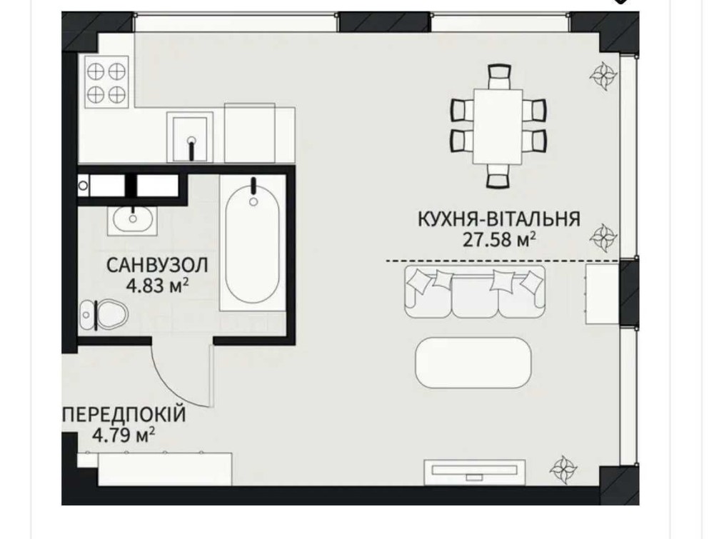 • Площа кухні 27.58 м2