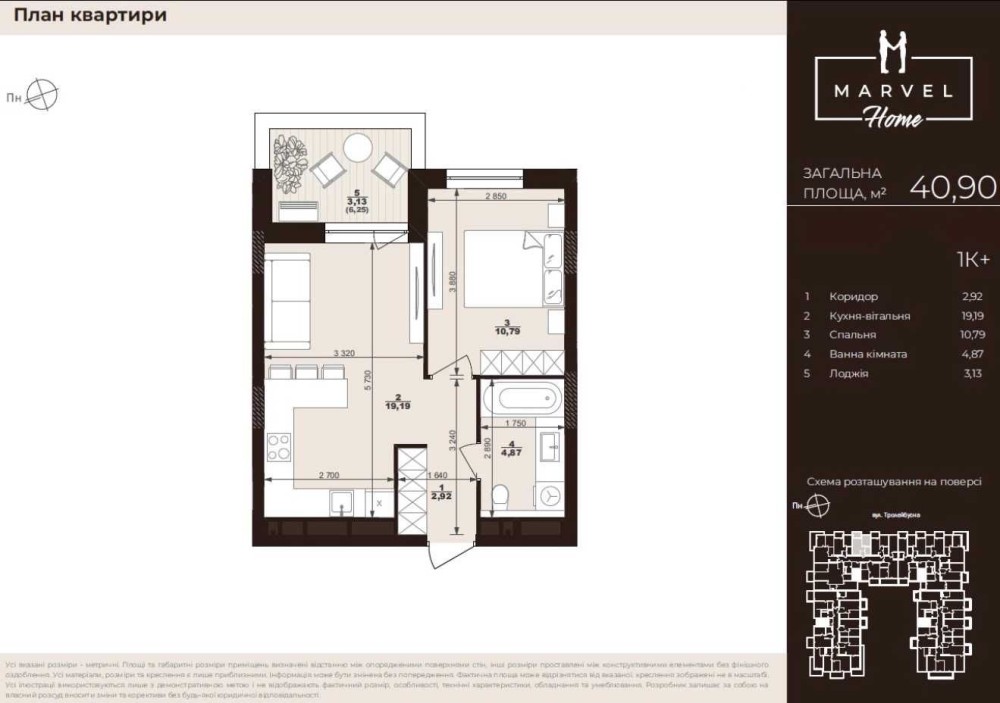Площа 40.9 м2, кухня студія 19.2 м2.