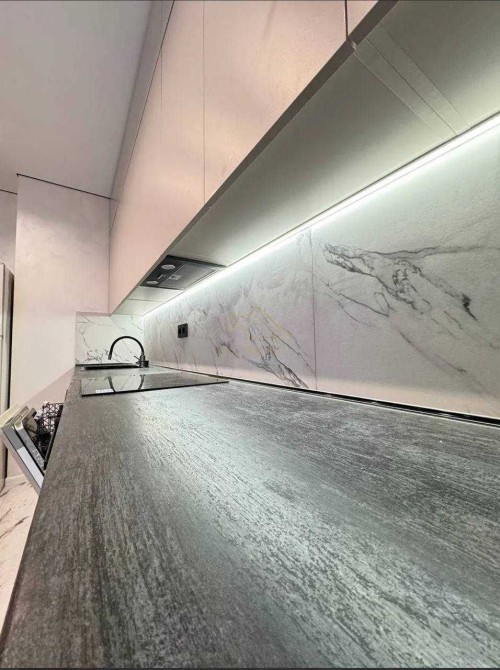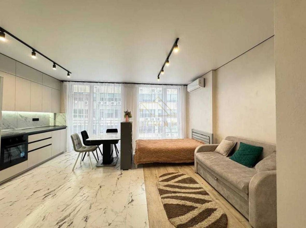 Квартира виконана в сучасному мінімалістичному стилі з якісних матеріалів у світлих тонах. Простір грамотно зонований: кухня, обідня зона та спальне місце гармонійно поєднані, що створює відчуття комфорту та простору.
