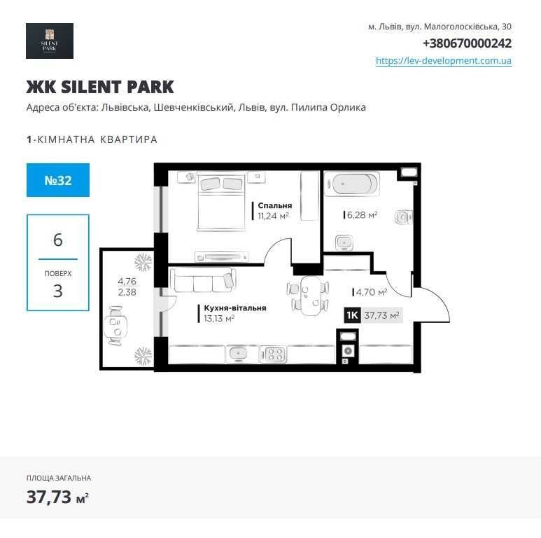 Продаж 1-кім квартири в ЖК Silent Park вул. Орлика Lev Development