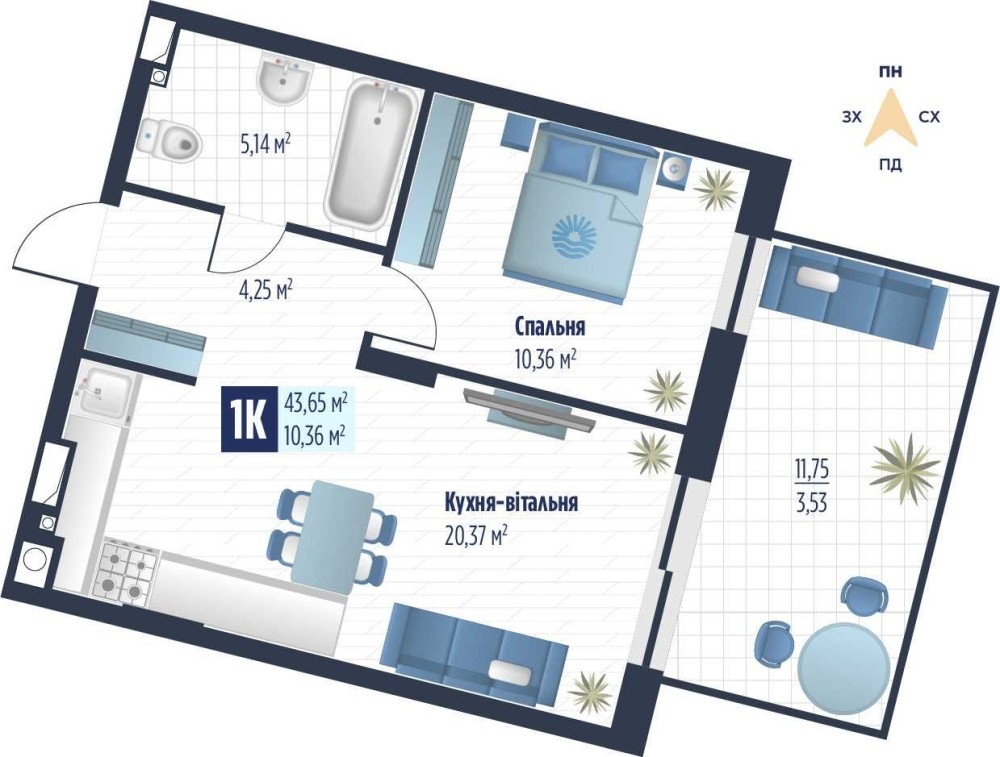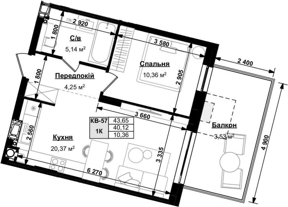 • Загальна площа 43.65 м2