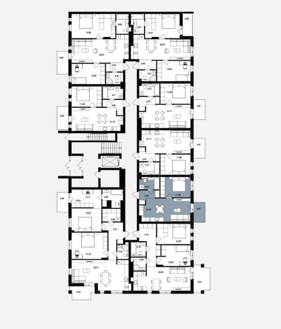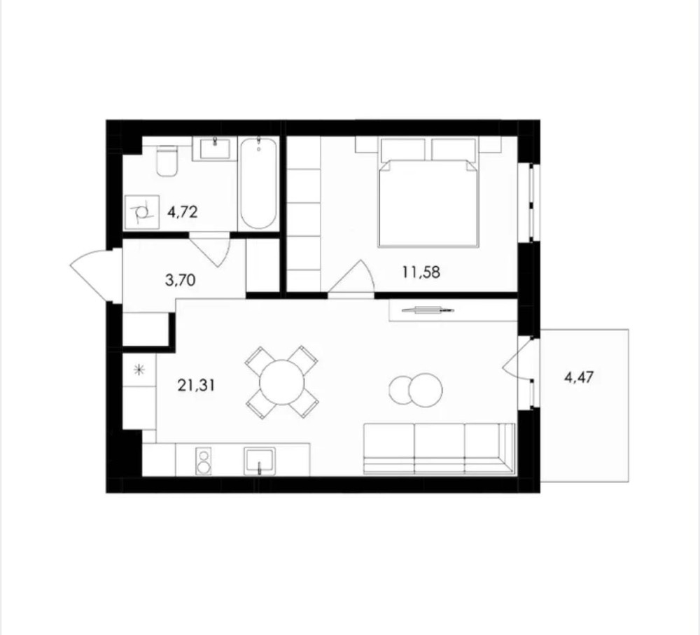 Спальня(11,5м2), кухня-студія (21,3м2), ванна(4,7м2) та балкон