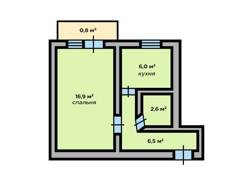 Планування: спальня з виходом на балкон 16,9 м² та 0,8 м², кухня 6,0 м², ванна 2,6 м², коридор 6,5 м².