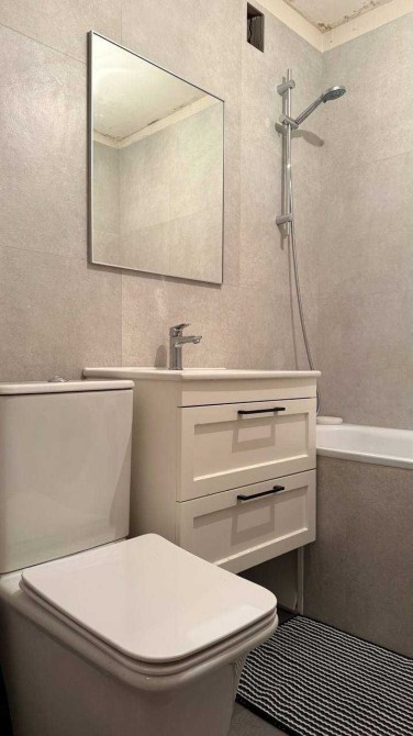 Санвузол виконаний у сучасному стилі з використанням світлої керамічної плитки