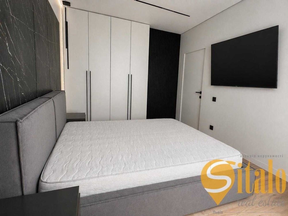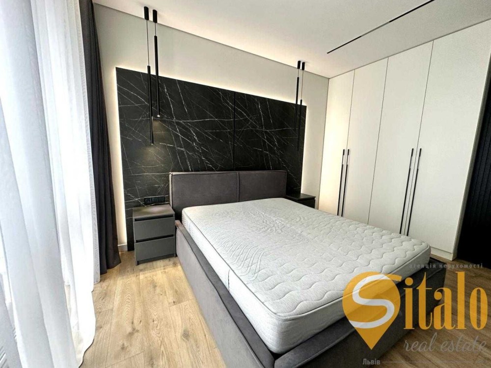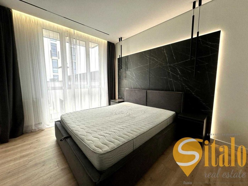 Кухня-вітальня 22,4 м² з панорамними вікнами, окрема спальня 13 м², гардеробна.