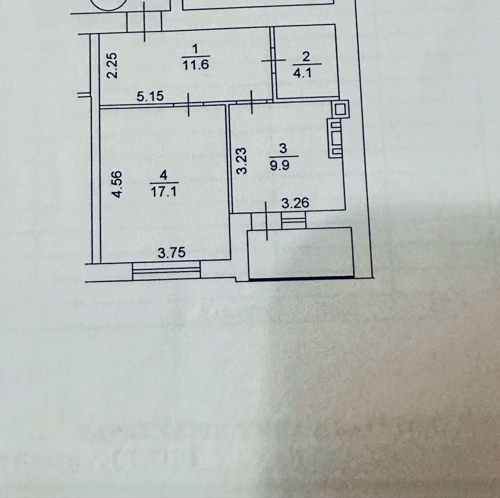 Загальна площа квартири 46.8 кв.м , житлова кімната простора 17.1 кв.м , кухня 9.9 кв.м, коридор 11.6 кв.м , с/у -4.1 кв.м.
