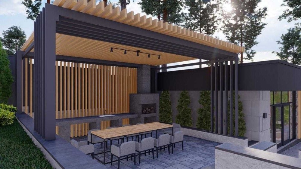Центральний фасад із високим фронтоном та другим світлом формує відчуття простору вже з порога. Лаконічна геометрія, поєднання світлої штукатурки, натуральних текстур і темного металевого даху створюють стриманий, дорогий вигляд.