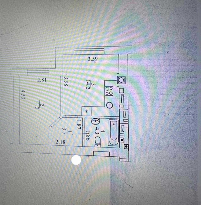 Параметри: 33.4 м² (Кухня 14.2 / Кімната 11.2). 1-й поверх.