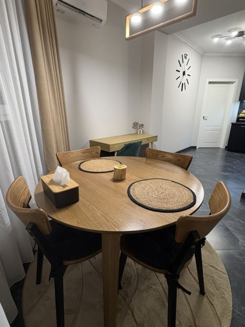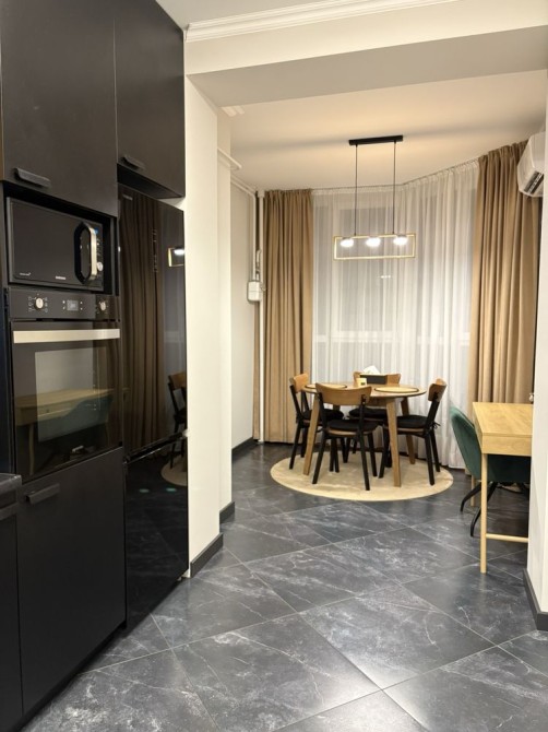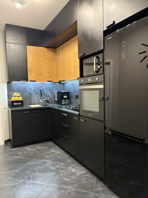 - Кухня:вбудована з газовою поверхнею, духового шафою, витяжкою, посудомийною машиною та холодильником