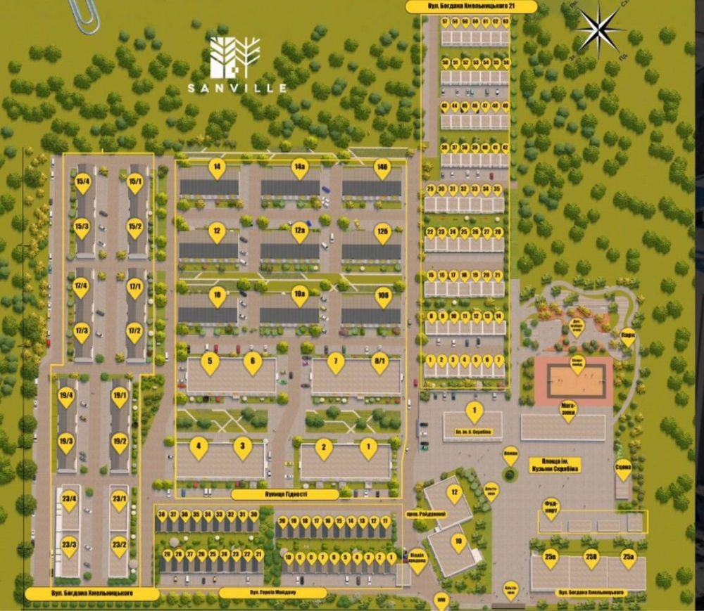 Паркомісця, дитячі та спортивні майданчики, зони відпочинку.