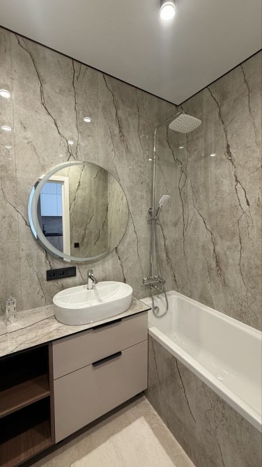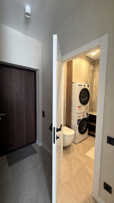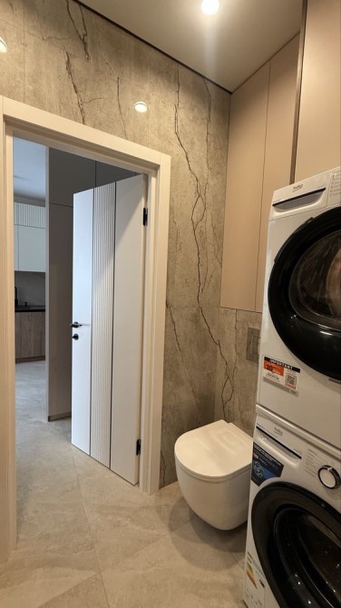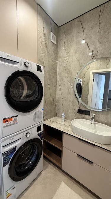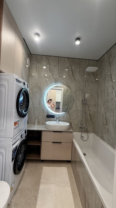 Ванна кімната укомплектована: якісною сантехнікою (крани, душ-система), ванною (не душ), рушникосушкою, вмонтованими меблями, пральною та сушильною машинами.