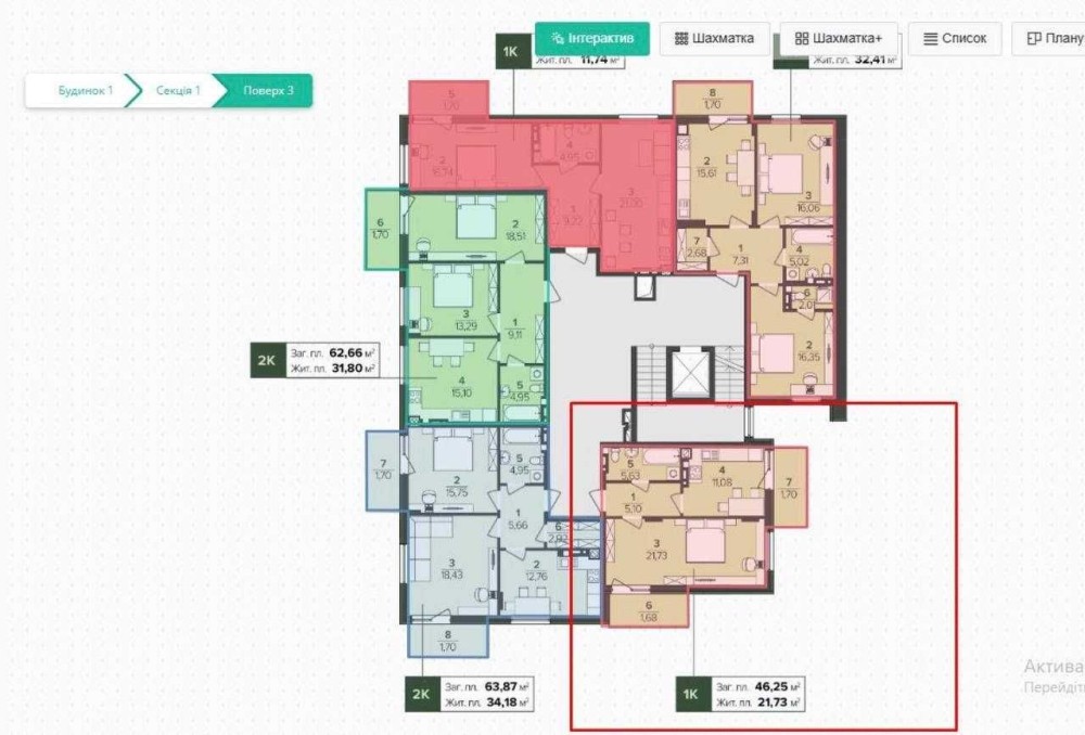 Загальна площа 46,35 м.кв,, житлова площа 21.73 м.кв.
