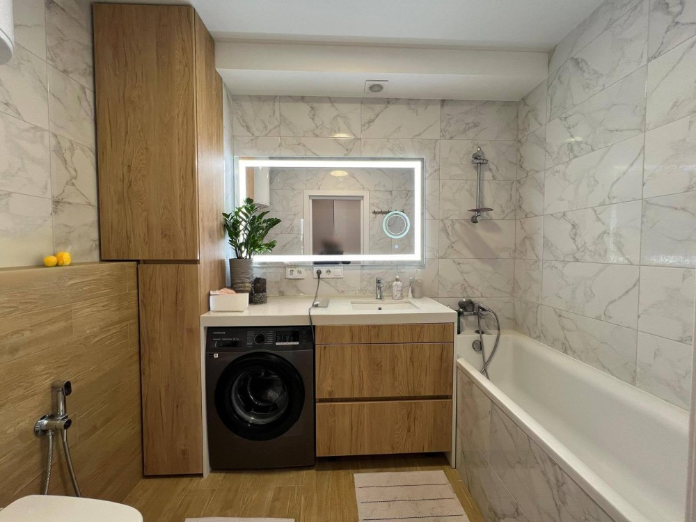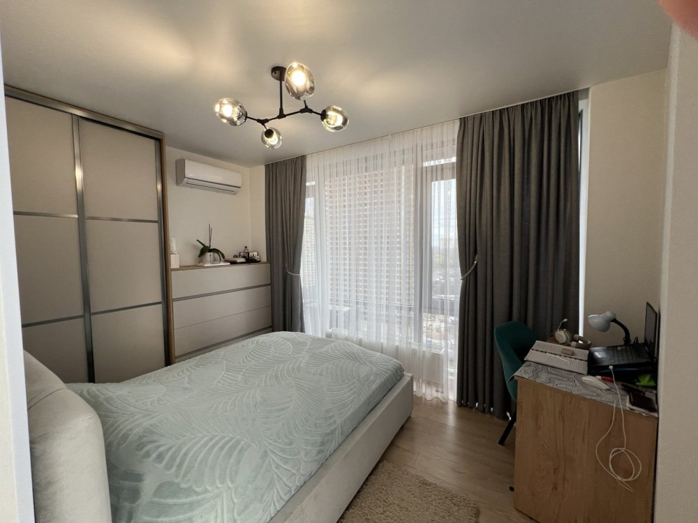 Укомплектована всім необхідним для комфортного проживання: 2 кондиціонери, холодильник з морозильною камерою, духова шафа,електричний котел,шафи для зберігання речей, кухонні вмонтовані меблі,вмонтована посудомийка.