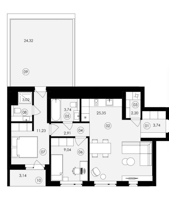 Два санвузли, гардеробна, лоджія, тераса.
